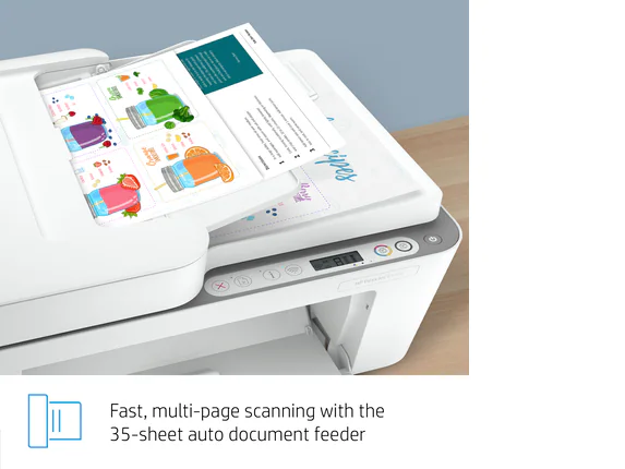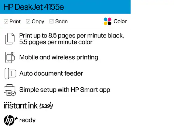 Get all the basics of printing, scanning, and copying with an easy-to-use interface with the DeskJet Plus 4155 All-in-One Printer from HP. The DeskJet Plus 4155 has a maximum print resolution of 4800 x 1200 optimized dpi and can print at speeds up to 8.5 ppm and 5.5 ppm for black and color prints, respectively. A flatbed and 35-page ADF scanner allow for scanning and copying with an optical resolution of 1200 dpi for documents up to 8.5 x 11.7″, and the unit makes up to nine copies at a time. Built-in wireless capabilities let you remotely access the printer, and with the HP Smart app you print, scan, and copy everyday documents from your smartphone.